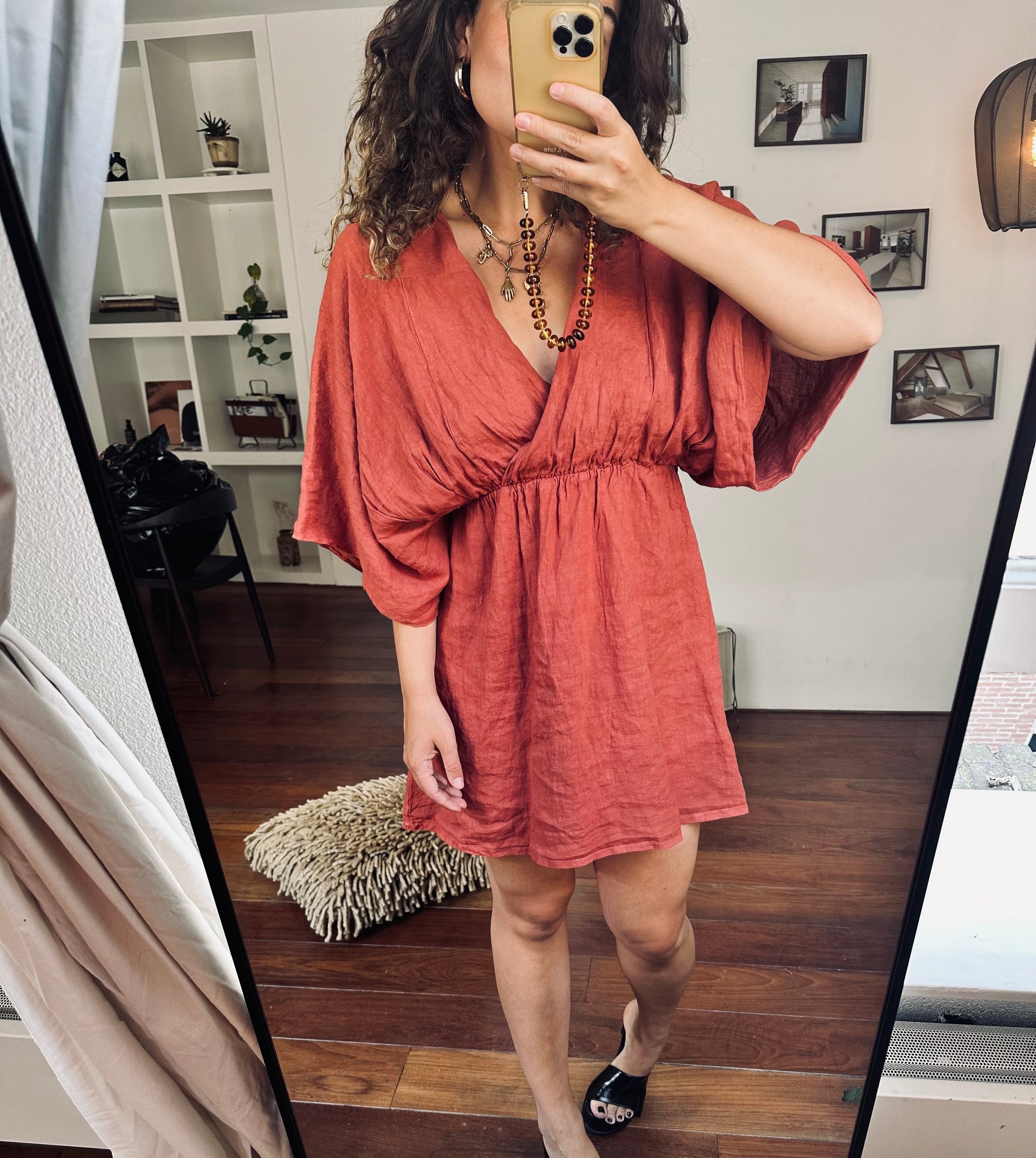 Prachtige linnen jurk! Fijne pasvorm, doordat hij op de perfecte plek in je taille valt.