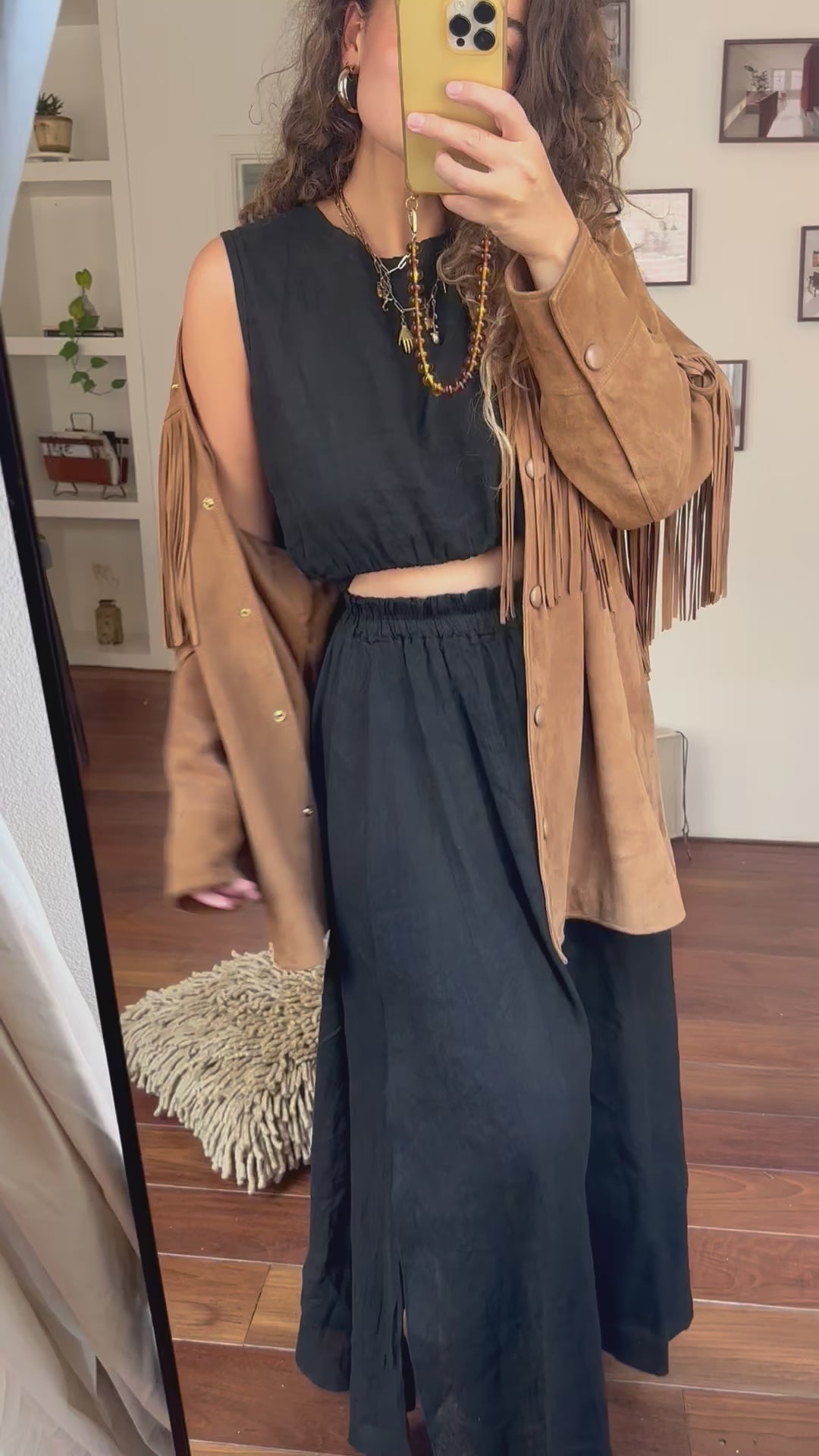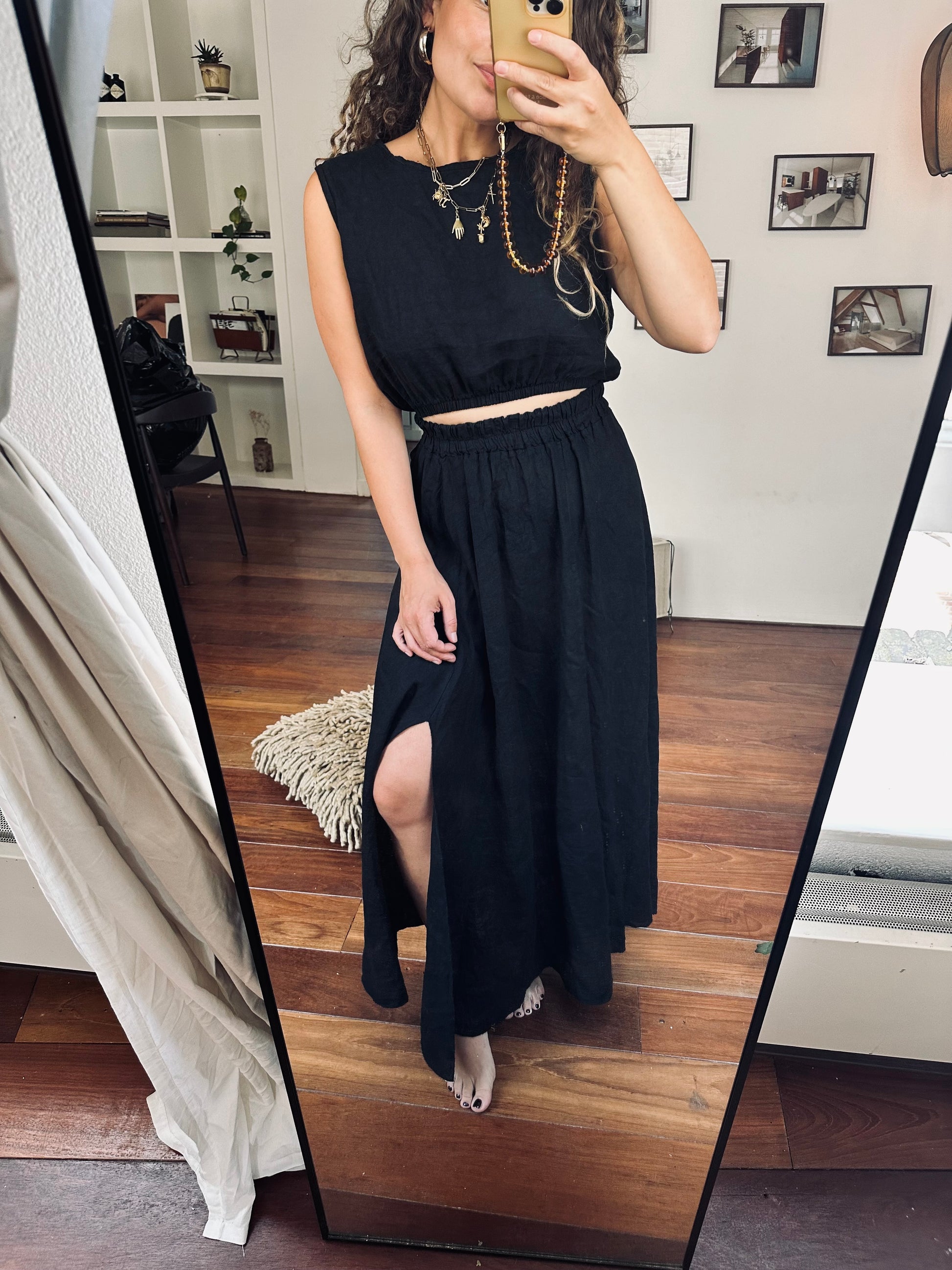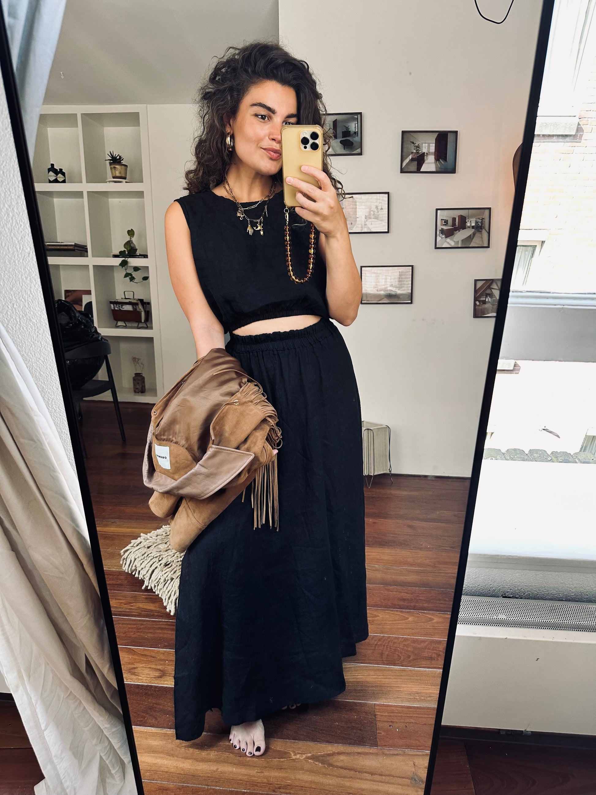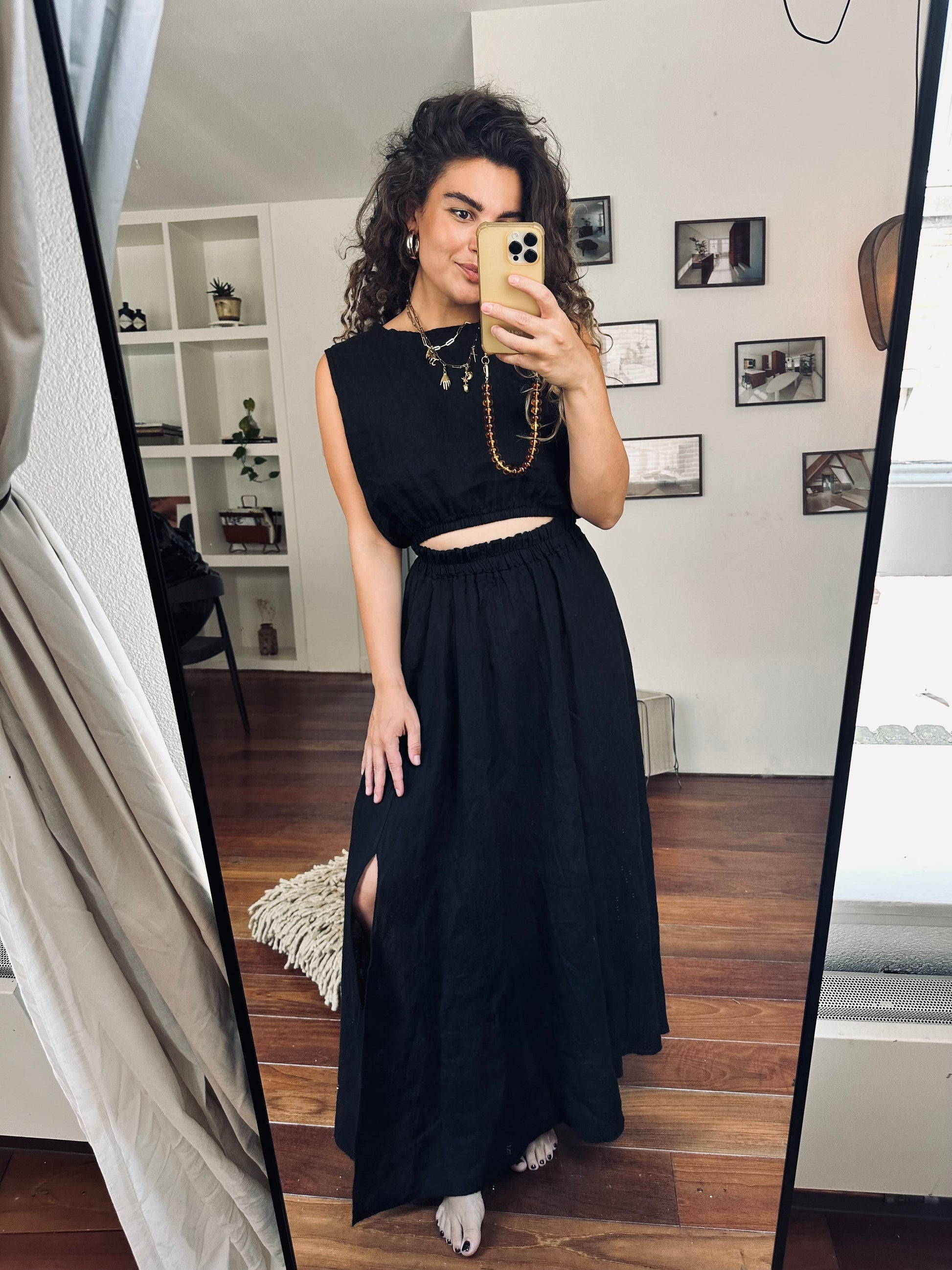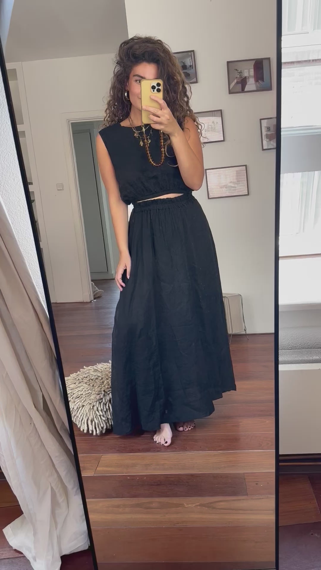 One size, kan perfect vanaf maat 36 tot een kleine maat 42. 100% linnen en zowel de top als rok heeft een elastieke band.